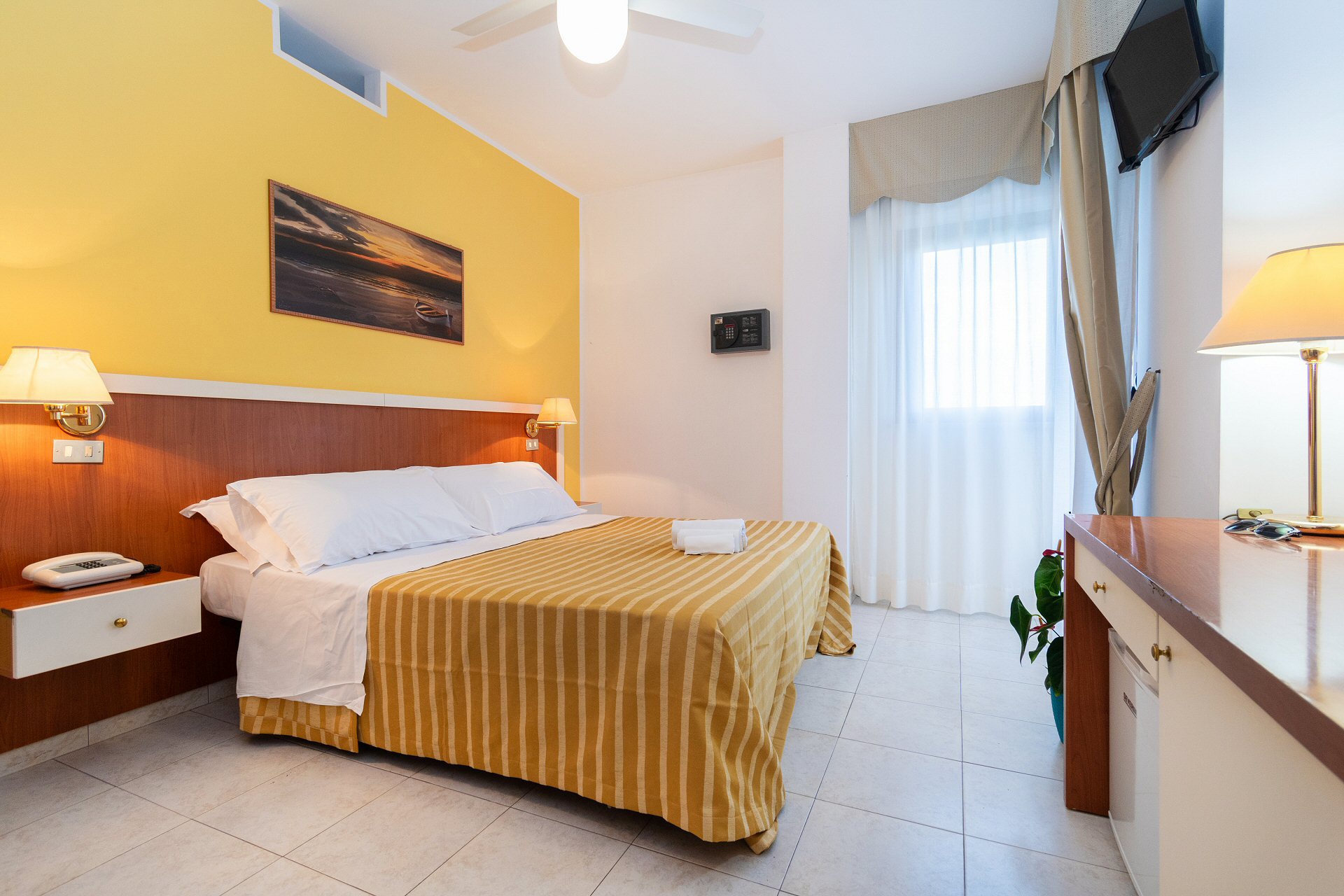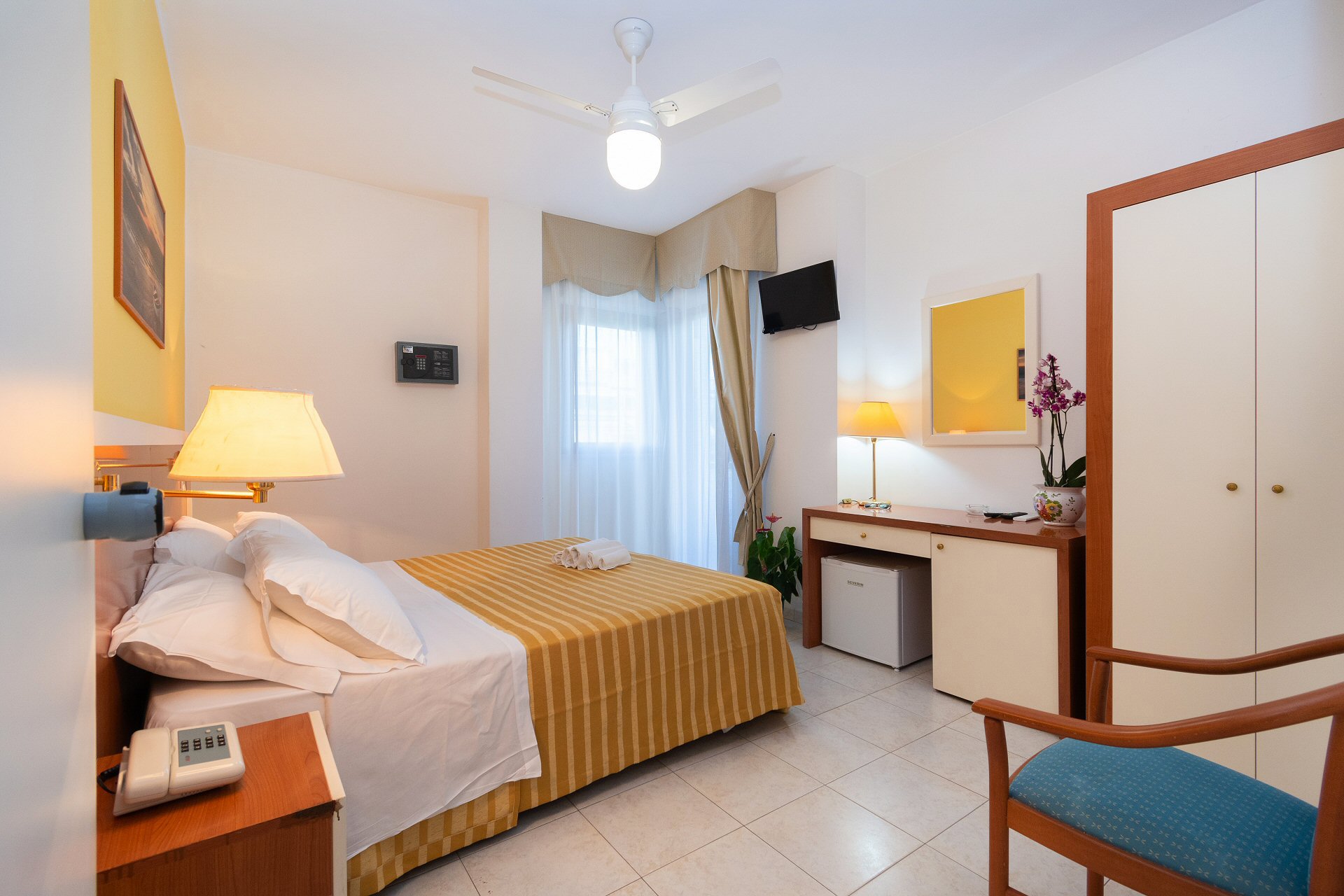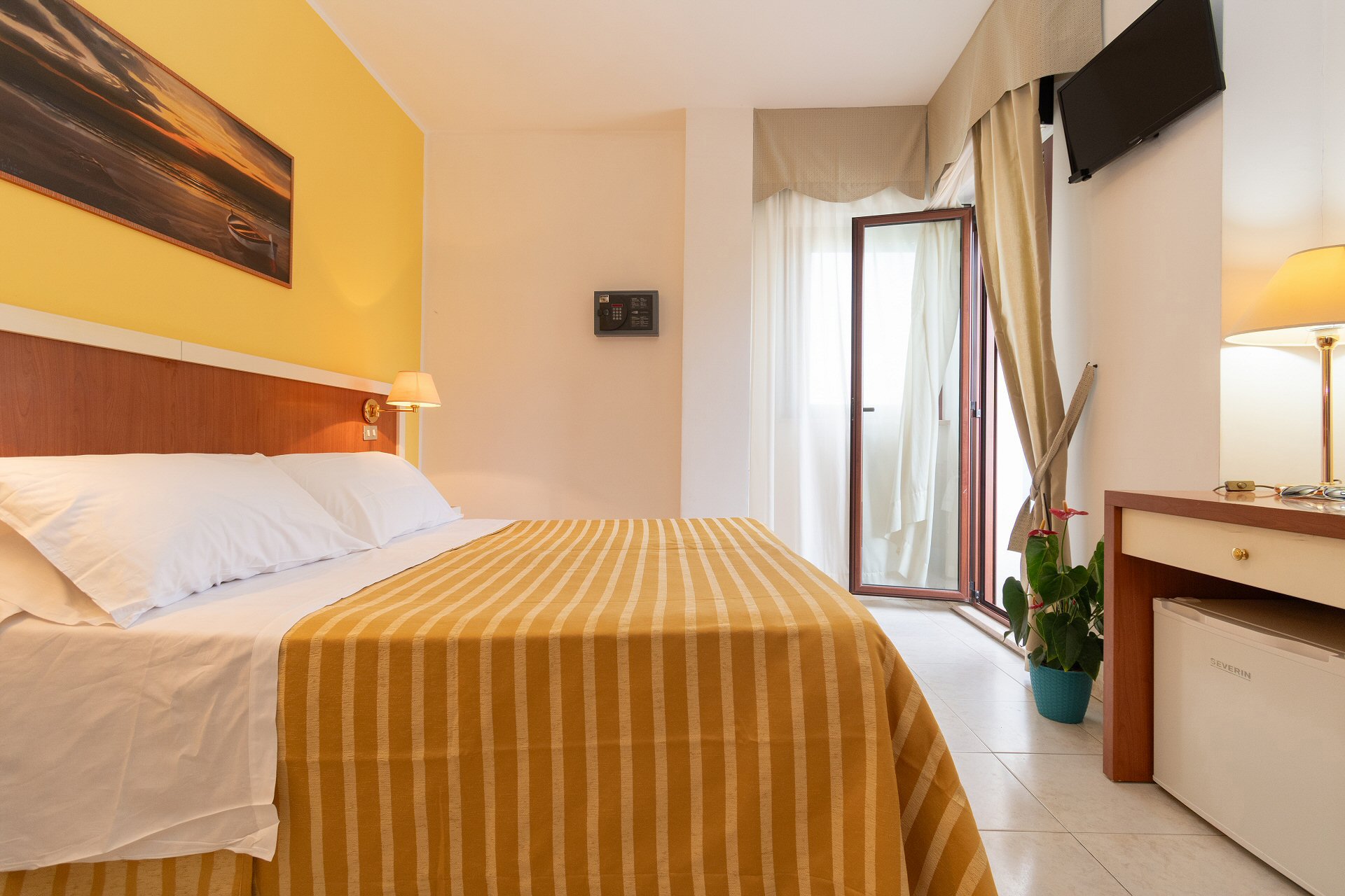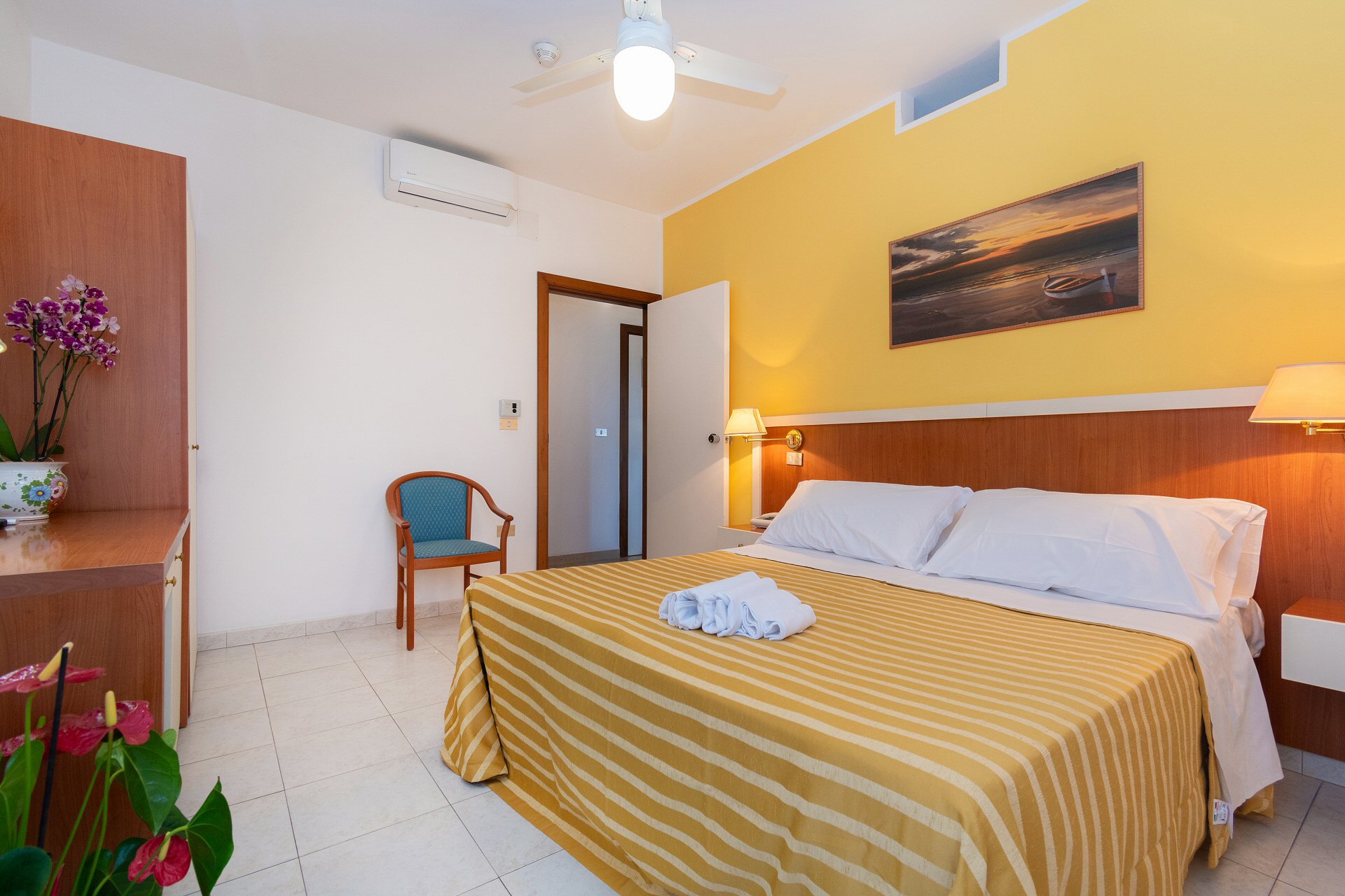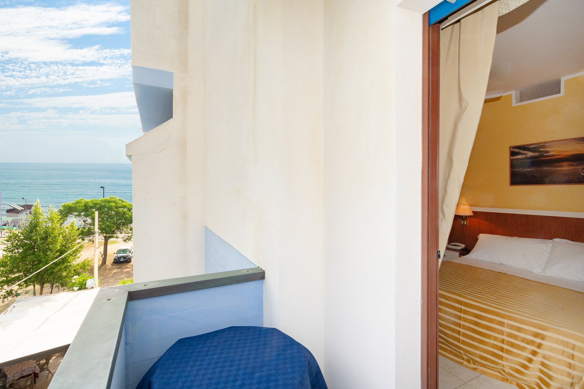 Le camere dispongono di due balconi vista colline e vista laterale sul mare (angolo piscina) e sono dotati di aria condizionata regolabile e autonoma.