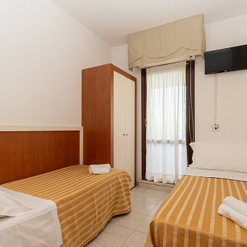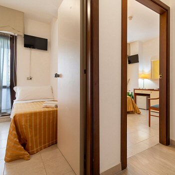 Die ideale Lösung für große Familien, bestehend aus zwei miteinander verbundenen Zimmern: eines mit einem Doppelbett und eines mit zwei Einzelbetten.