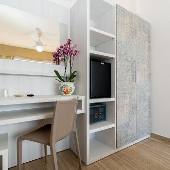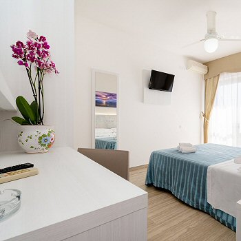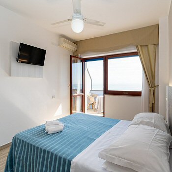Alle Zimmer verfügen über einen eigenen Balkon mit Blick auf das Meer und eine regulierbare, unabhängige Klimaanlage.